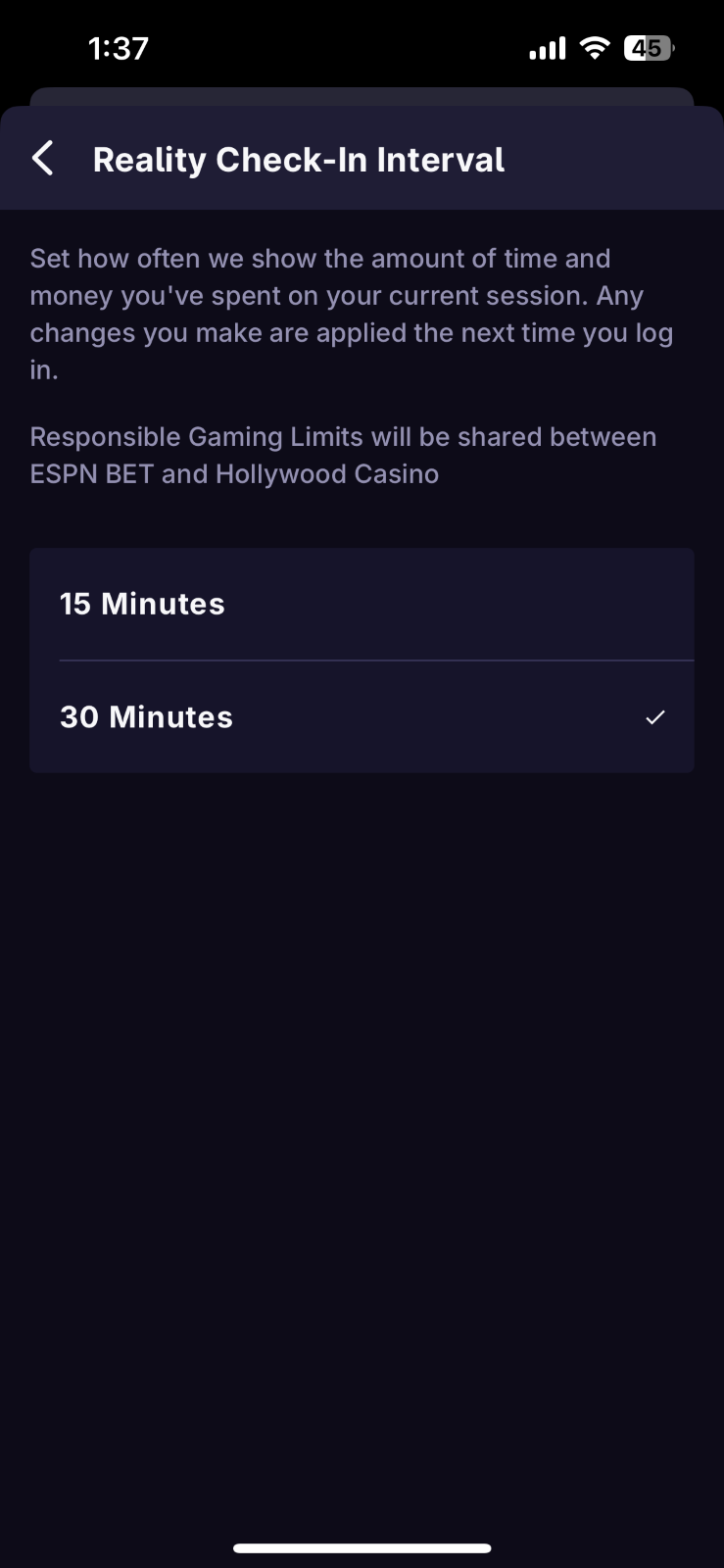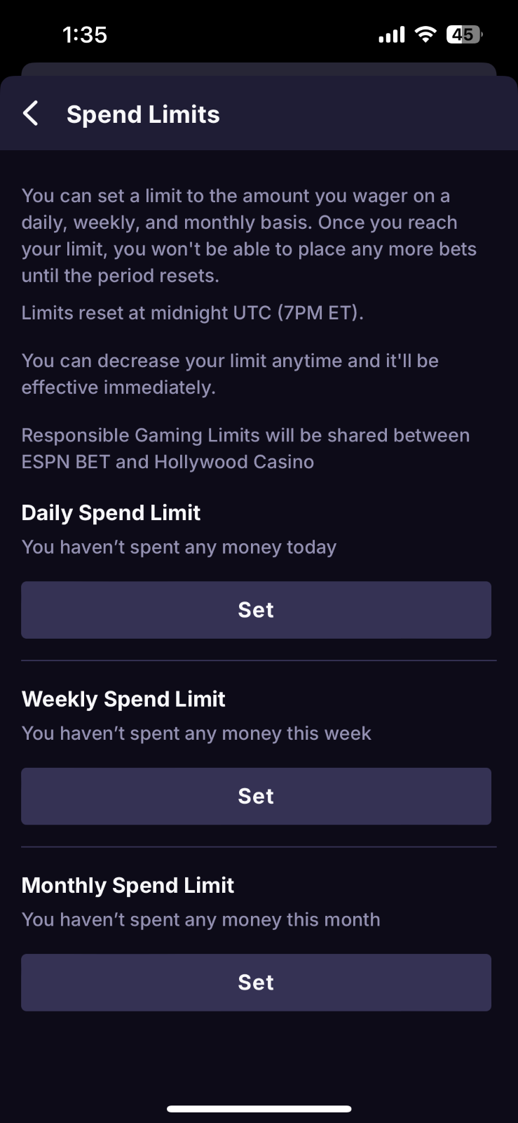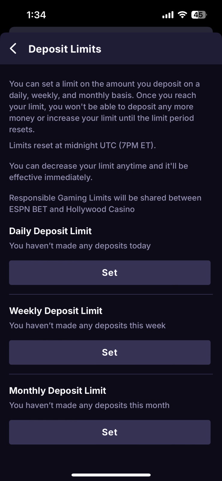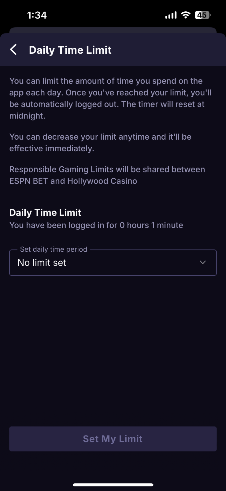 Daily Time Limit - Set a limit on the amount of time you spend on theScore Bet and Hollywood Casino per day. Once you hit your self-imposed daily time limit, you will be logged out and will no longer have access to theScore Bet and Hollywood Casino until it resets the following day 12 AM ET.