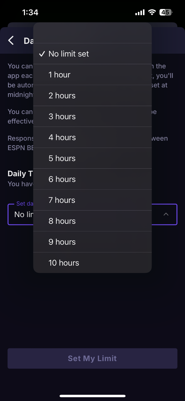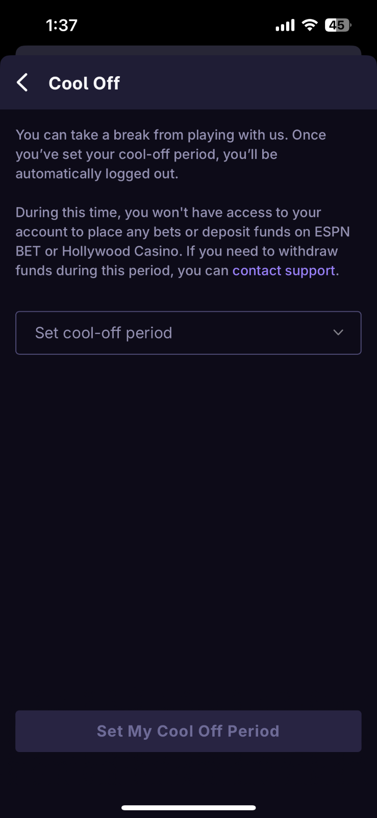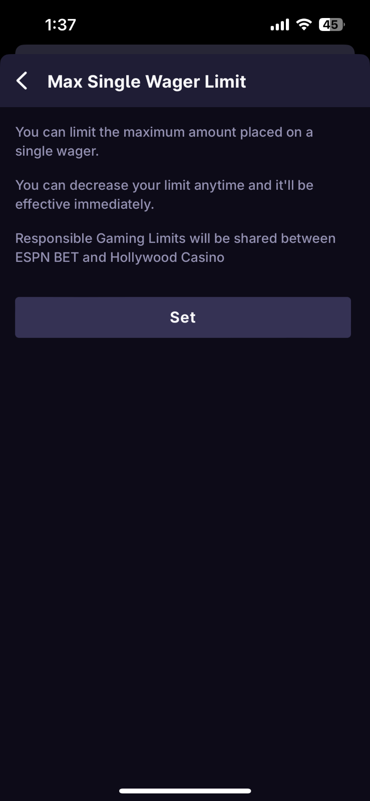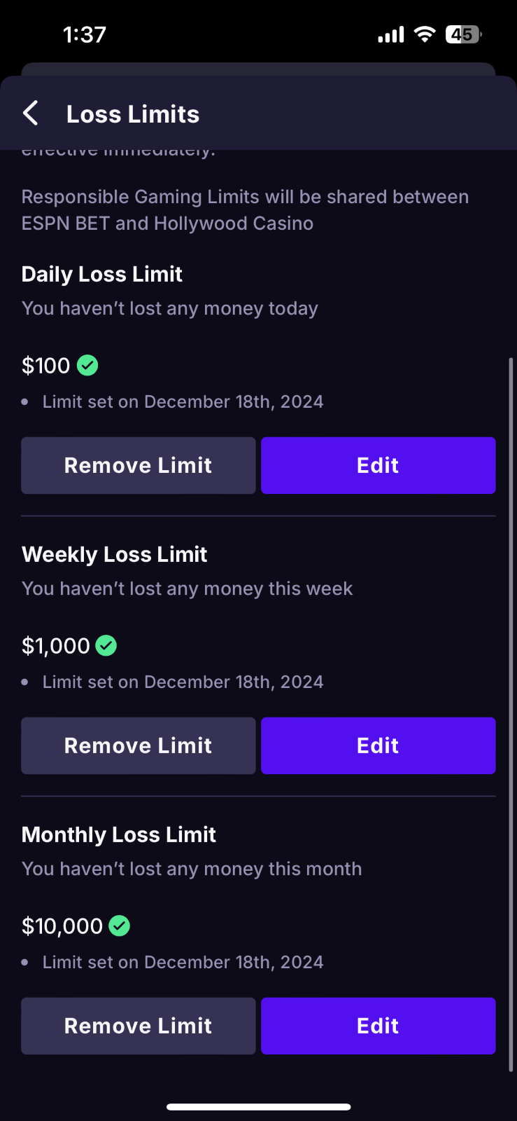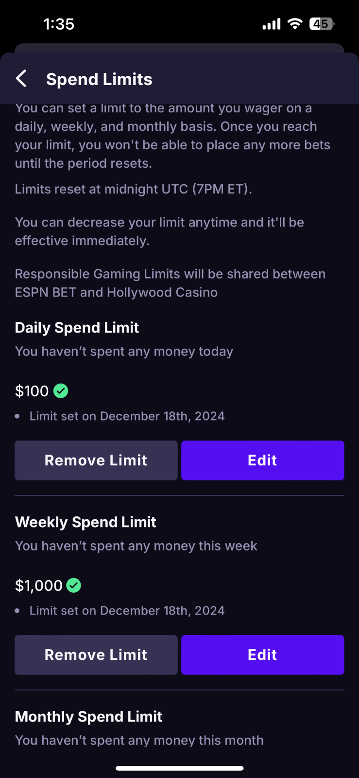 Daily Time Limit - Set a limit on the amount of time you spend on theScore Bet and Hollywood Casino per day. Once you hit your self-imposed daily time limit, you will be logged out and will no longer have access to theScore Bet and Hollywood Casino until it resets the following day 12 AM ET.