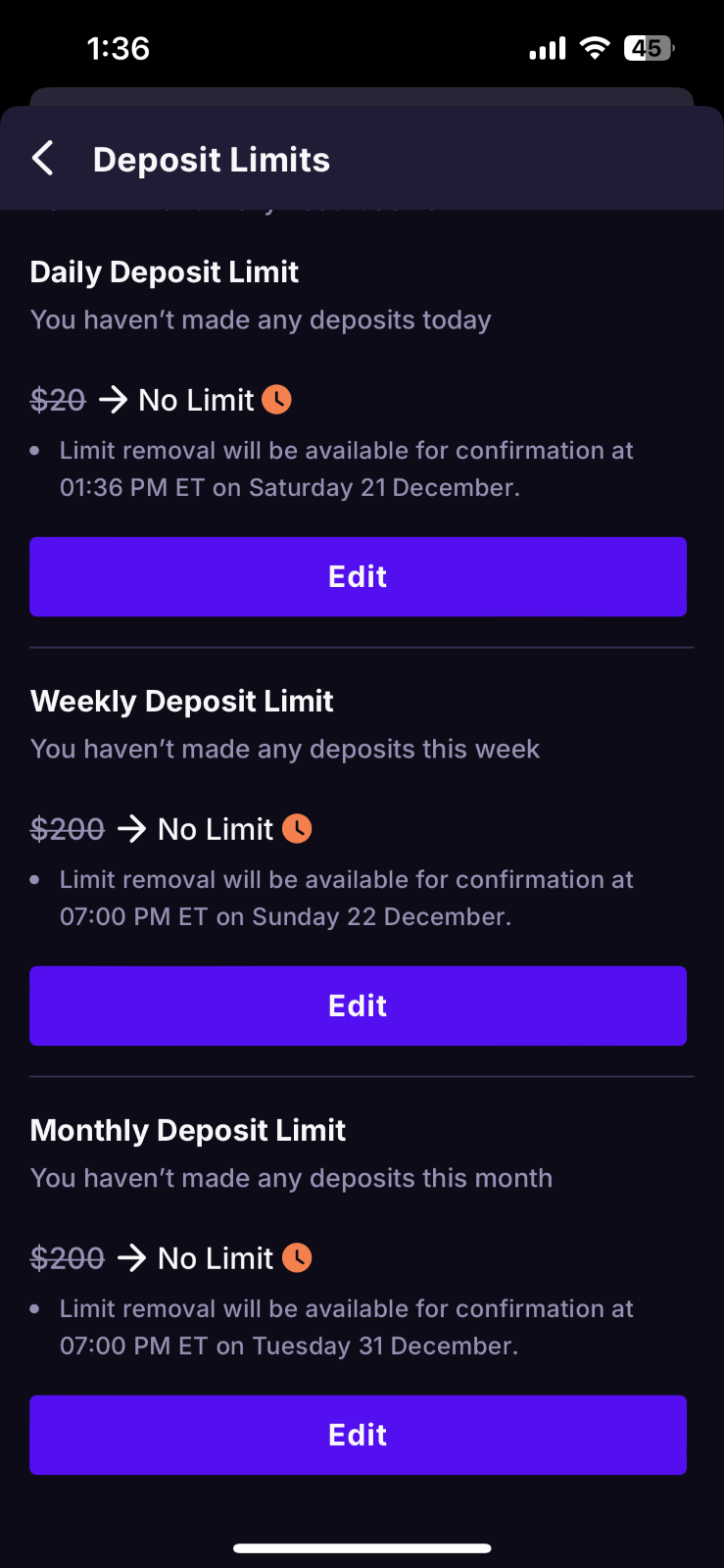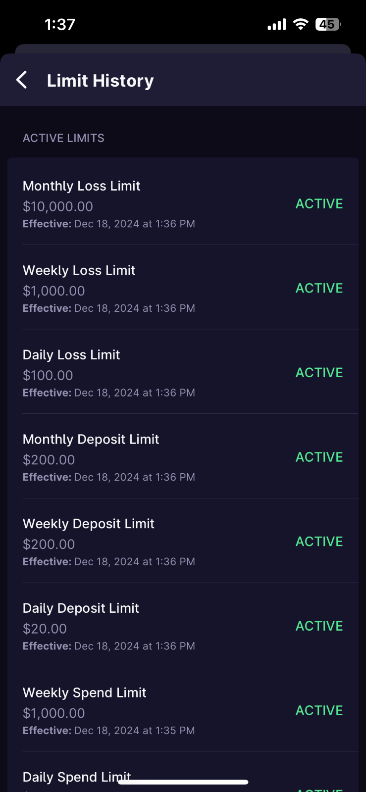 Limit History - To view all active and past limits set on your account, visit the Limit History section in the Responsible Gaming section.