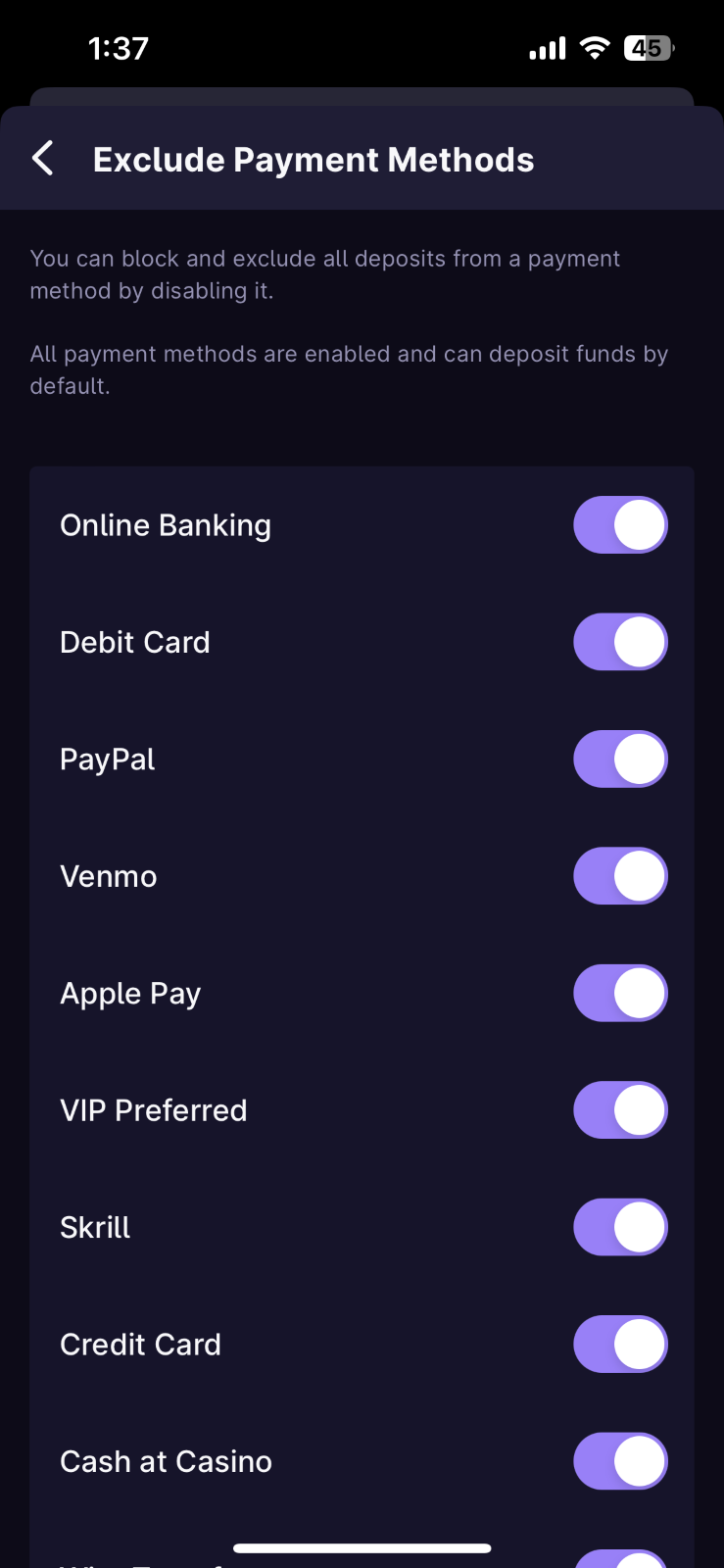 Exclude Payment Methods - You can block and exclude all deposits from a payment method by disabling it. All payments methods are enabled and can deposit funds by default.